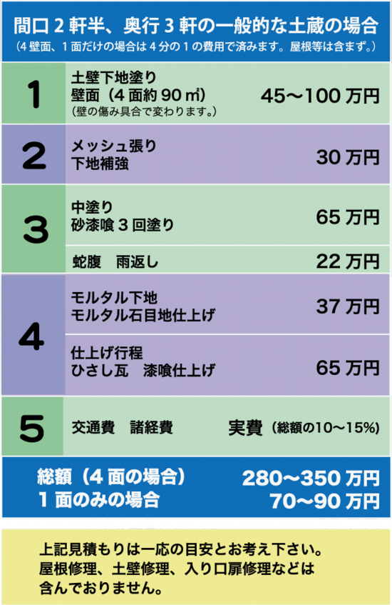 土蔵を直すのには、現代では考えられない位の手間と時間がかかりますが、その分大きなメリットも有ります。その辺を理解した上、ご要望下さい。
