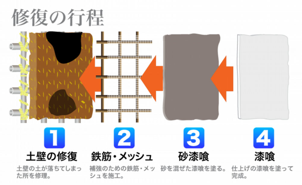 この修復工程は、一番多い白壁が剥離、脱落してしまった場合を想定しています。